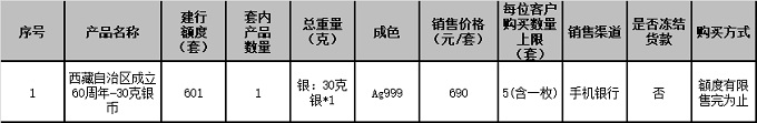 根据中国人民银行贵金属纪念币发行安排,“西藏自治区成立60周年金银纪念币”已于近日公告发行,我行根据安排将参与本产品第二批的销售工作。现将有关事项公告如下: